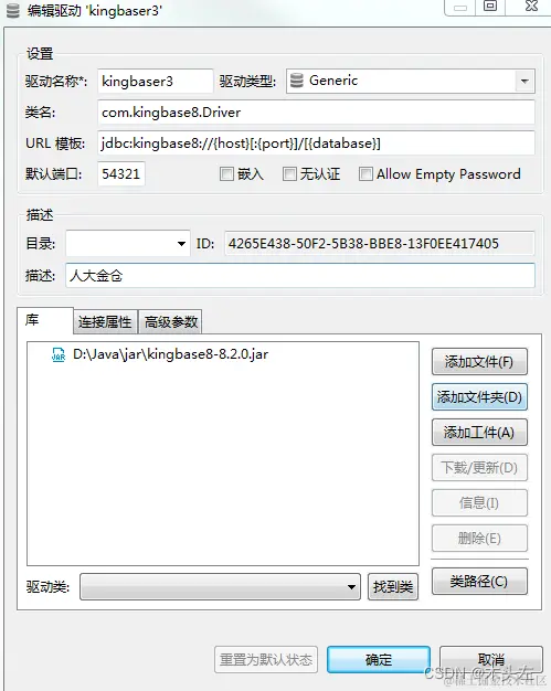 URL模板:jdbc:kingbase8://{host}[:{port}]/[{database}] 默认端口:54321 确认驱动信息