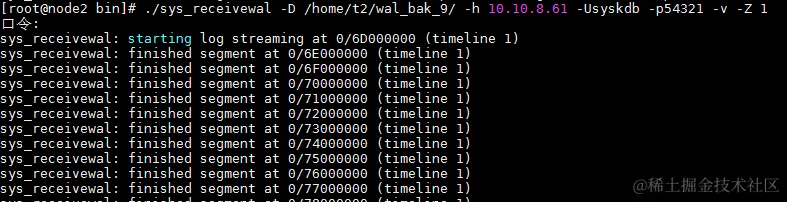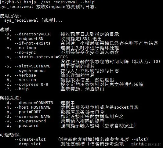 例如 ./sys_receivewal -D /home/t2/wal_bak -h 10.10.8.61 -Usyskdb -p 54321 --drop-slot --slot=wal_bak –v