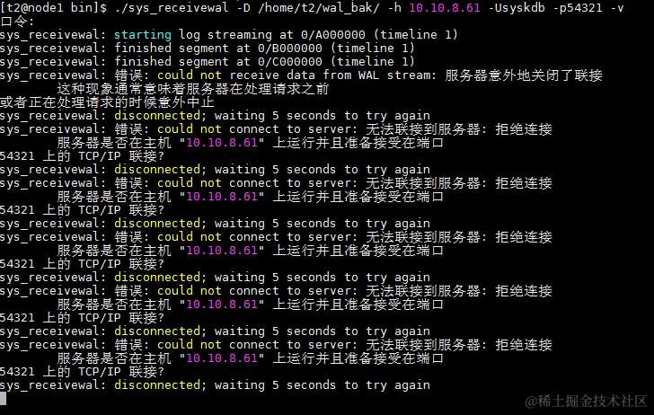 例如 ./sys_receivewal -D /home/t2/wal_bak/ -h 10.10.8.61 -Usyskdb -p54321 -v -Z 1