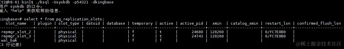 (3)在主库上使用select * from pg_replication_slots;命令查看复制槽