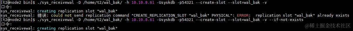 例如 ./sys_receivewal -D /home/t2/wal_bak/ -h 10.10.8.61 -Usyskdb -p54321 --create-slot --slot=wal_bak -v --if-not-exists