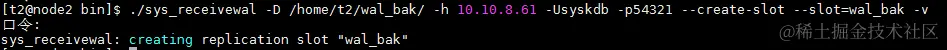 例如 ./sys_receivewal -D /home/t2/wal_bak/ -h 10.10.8.61 -Usyskdb -p54321 --create-slot --slot=wal_bak -v