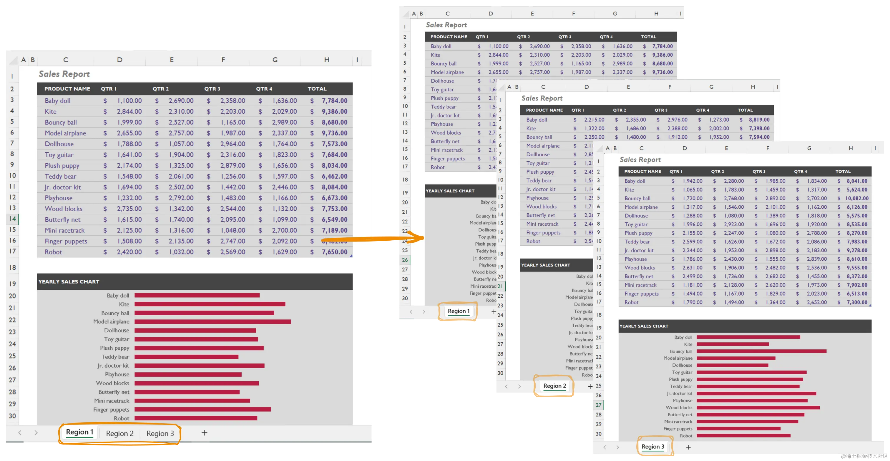 在Excel中创建的大多数商业报告不是单页的文档,而是包含了多个上下文相关的信息,这些信息被存储在多个工作表中。例如我们的一些地区销售报告、按部门分类的员工记录、每家店铺的库存清单等。