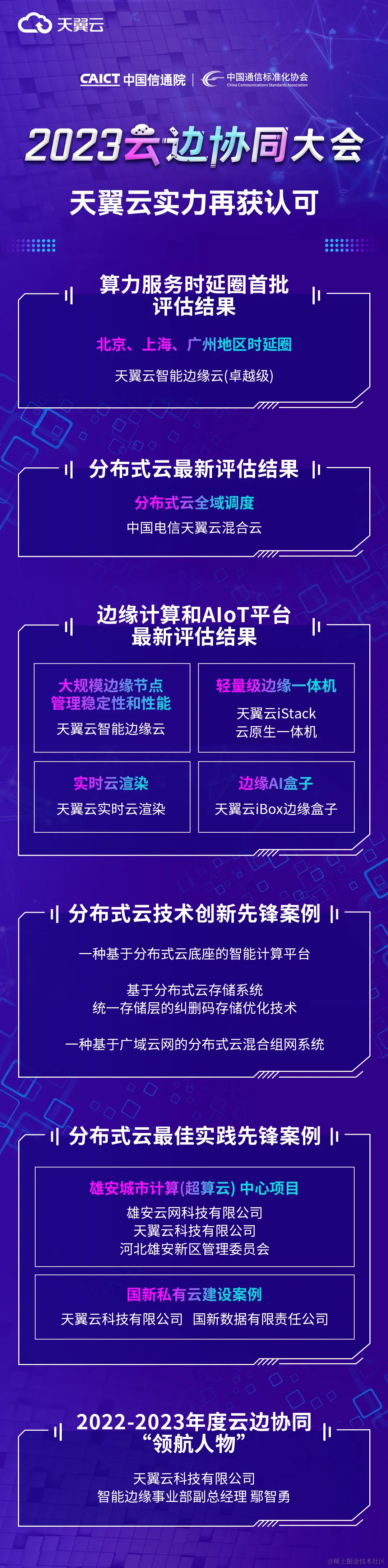 2023年6月30日,由中国信息通信研究院、中国通信标准化协会主办的“2023云边协同大会”在北京举办。大会聚集了产学研用各界大咖,深入探讨云边协同趋势及产业创新发展。大会颁发了多个奖项,天翼云分别斩获三项“分布式云技术创新先锋案例”奖,两项“2023年度分布式云最佳实践先锋案例”奖、2022-2023年度云边协同“领航人物”奖,同时,天翼云多项技术及产品通过了2023上半年分布式云、边缘计算、AIoT、算力服务时延圈首批评估,技术创新及实践能力获得了权威认可。
