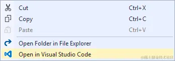 只需在“解决方案资源管理器”中右键单击任何解决方案、项目、文件夹或文件,然后选择“在 Visual Studio Code 中打开”,即可在 Visual Studio Code 中打开它。