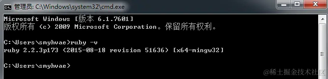 安装完ruby之后,在命令行中输入ruby -v,查看ruby的的版本: