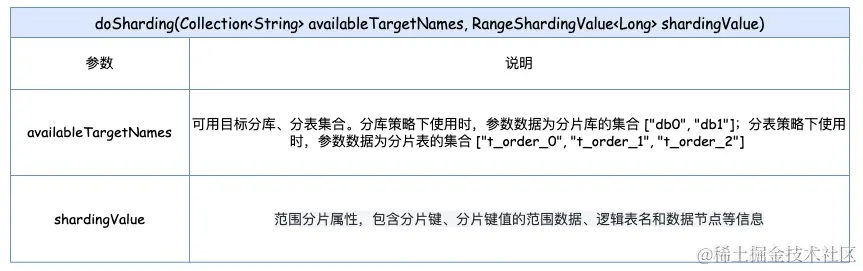 重写方法 doSharding(Collection availableTargetNames, RangeShardingValue rangeShardingValue),该方法可以返回多个分片数据源或分片表数据。有两个参数:一个是可用目标分库、分表的集合,另一个是精准分片属性对象。