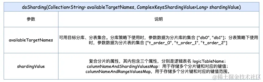 重写复合分片方法 doSharding(Collection availableTargetNames, ComplexKeysShardingValue shardingValues) 实现定制的多分片健逻辑,该方法有两个参数:一个是可用目标分库、分表的集合;另一个是多分片健属性对象。