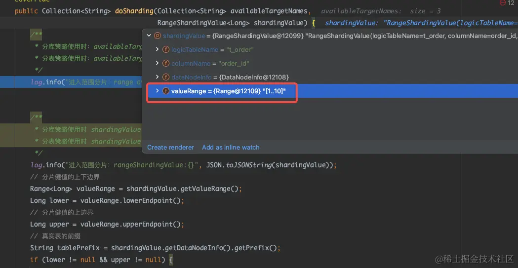 接着执行一个范围查询的 SQL,此时将进入范围分片的 doSharding() 方法。通过观察 shardingValue.getValueRange() 方法中分片键的数值范围,可以发现这些数值范围是从SQL查询中解析得到的。