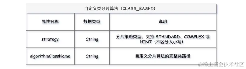 在这里,自定义分片算法的类型(Type)统一为CLASS_BASED,包含两个属性:strategy 表示分片策略类型,目前支持三种:STANDARD、COMPLEX、HINT;algorithmClassName 表示自定义分片算法的实现类路径。此外,还可以向算法类内传入自定义属性。