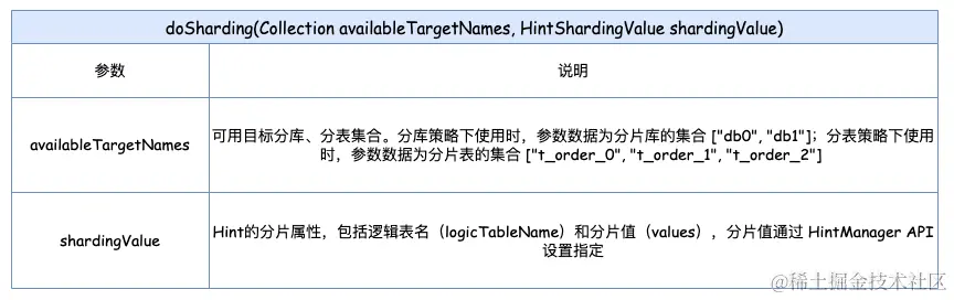 重写 HINT 核心分片方法 doSharding(Collection availableTargetNames, HintShardingValue shardingValue),以实现我们的定制逻辑。该方法接受两个参数:一个是可用目标分库、分表的集合,另一个是 Hint 分片属性对象。