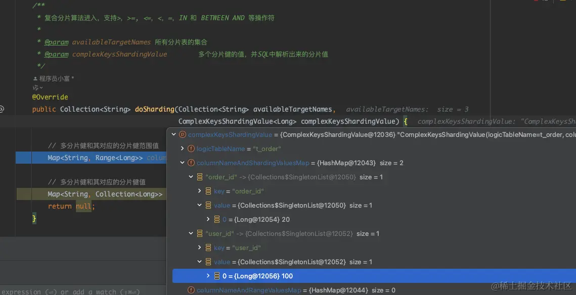 自定义COMPLEX复合分片算法,需要我们实现 ComplexKeysShardingAlgorithm<T> 接口(其中 T 代表接收的分片键值类型),并重写该接口内部的 3 个方法。其中,主要关注用于处理核心分片逻辑的 doSharding()方法,可以返回多个分片数据源或分片表数据;其他两个配置方法与上述类似,这里不再赘述。