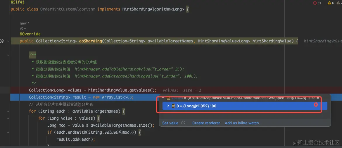 在插入测试数据时,默认会自动进入精确分片的 doSharding() 方法内,看到该方法会获取分片键的数值,根据我们的计算规则确定返回一个目标分片表用于路由。