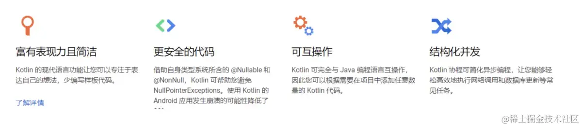 1).Kotlin语言简练,而且Kotlin里面可以没有空指针问题,在Android中使用Java就会存在很多令人头大的空指针问题。