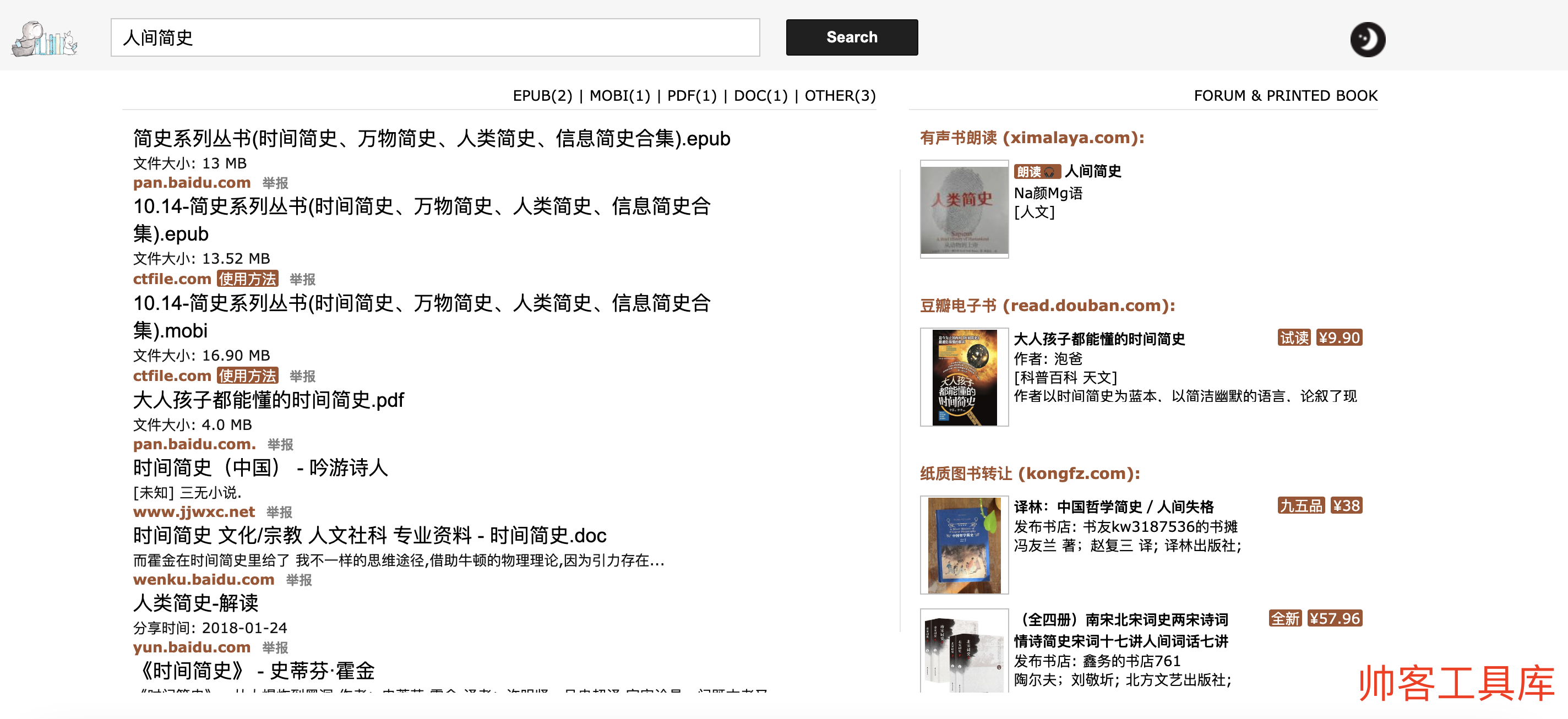 鸠摩搜书是一个专门提供电子书搜索服务的网站,用户可以通过它来搜索和下载各种格式的电子书,包括但不限于PDF、ePub、mobi等。这个网站汇集了互联网上众多电子书资源,很多你找不到资源的书,这个网站一定会让你惊喜的。