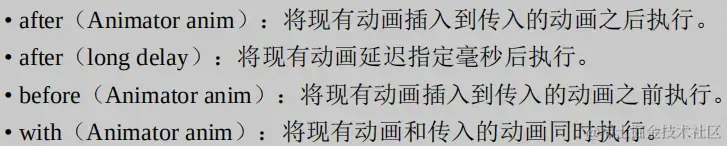 AnimatorSet提供一个play(),传入Animator对象(ValueAnimator或ObjectAnimator),返回一个AnimatorSet.Builder的实例。
