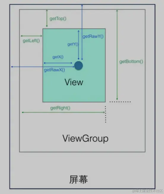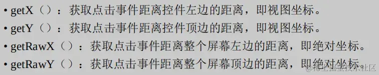 getX() getY()获取是相对于ViewGroup的坐标;getRawX() getRawY()获取的相对于屏幕的坐标(Android坐标)