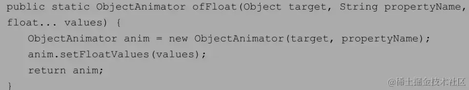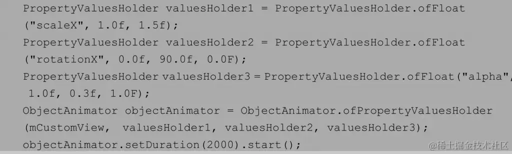- 注意:ObjectAnimator的属性必须要有get和set方法,否则无效。如果一个属性没有set和get方法,可以通过自定义一个属性类或者包装类给这个属性设置set和get方法。