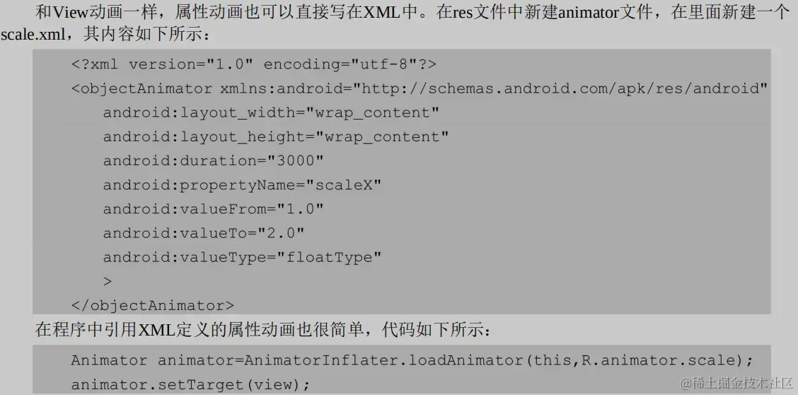 XML中创建属性动画:res文件中创建animator文件夹,将属性动画xml放入其中。