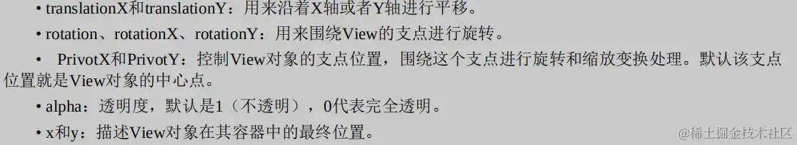 - Animation存在一些局限性,也就是动画改变的只是显示,但View的位置没有发生变化,View移动后并不能响应事件。