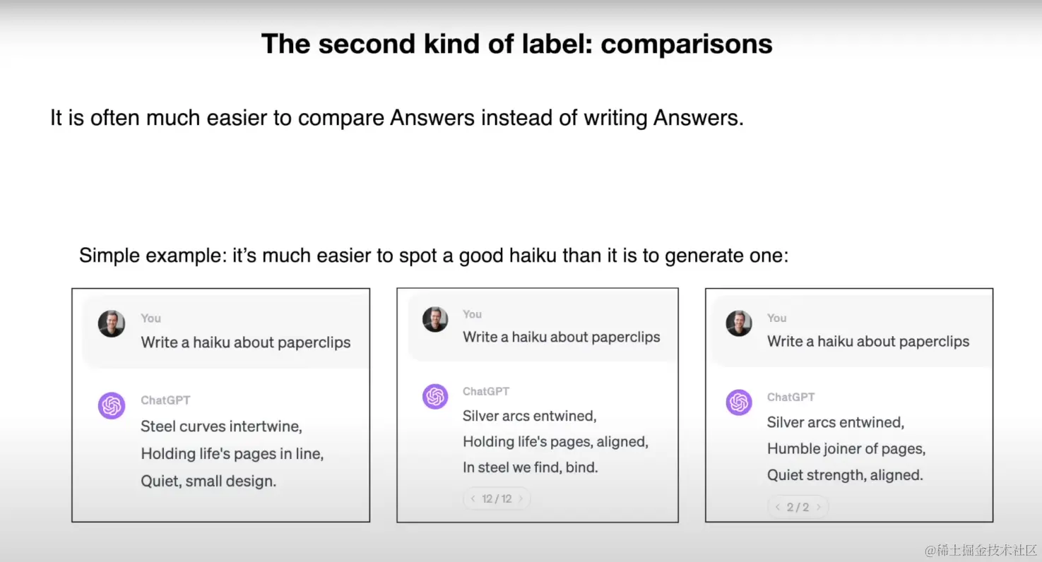在微调阶段的标注过程中,除了类似 Alpaca 这种给定输入和输出的微调方式外,还有一种数据构造成本更低的方式,即比较(comparisons)。我们会给模型提供一个输入,然后让模型生成多个可能的响应。然后会让人类标注员根据一套预先定义的标准,对这些响应进行排序。
