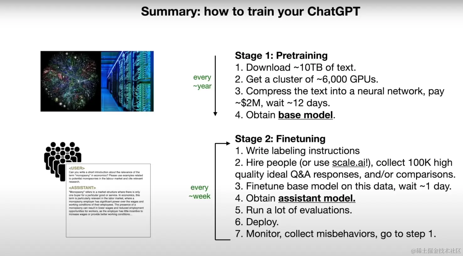 简而言之,GPT 的训练过程可以分成两个阶段,第一个阶段是基座模型的预训练 (pre-training),第二个阶段是微调(fine-tuning)。