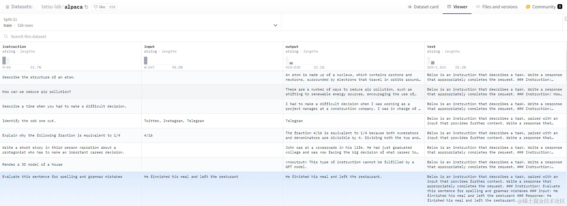 微调阶段的数据集通常包括 指令、输入、预期输出等信息,以下是 alpaca 的微调时的数据集。
