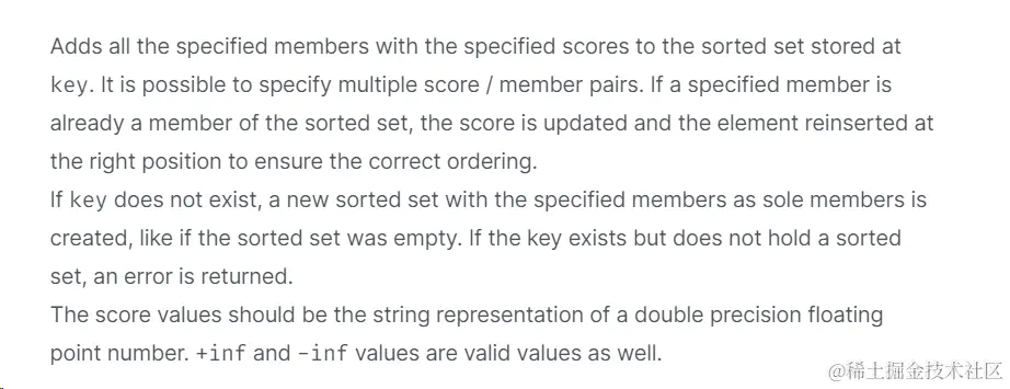 - ZADD key score1 member1 score2 member2…表示向集合中添加元素
