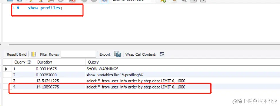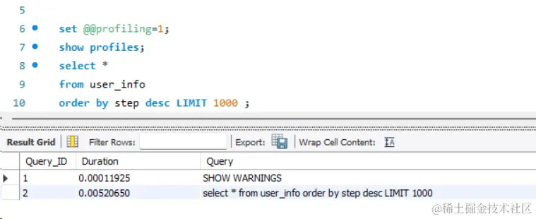 然后看下耗时,set @@profiling=1;,show profiles;