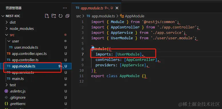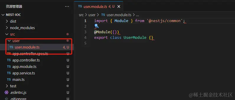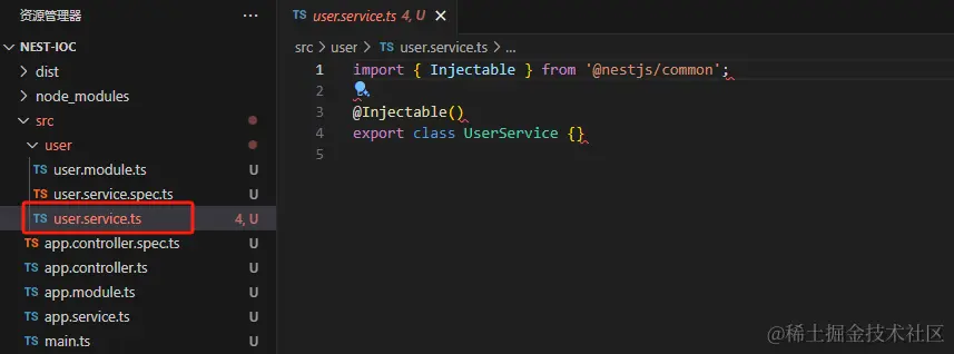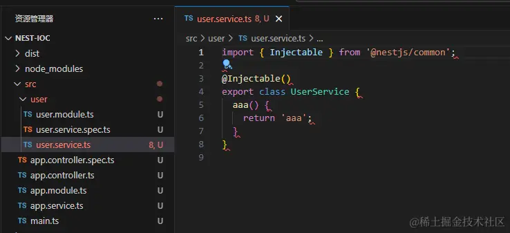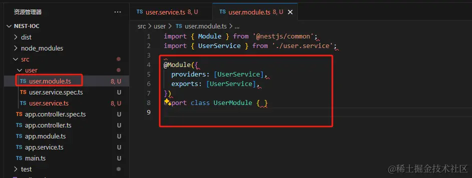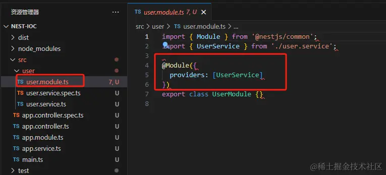 可以看到 他帮我们生成了代码,并自动添加到 user.module 的 providers 中