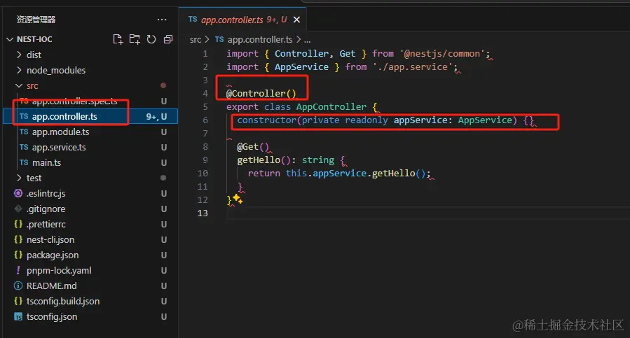 app.controller声明了 @Controller,代表这个 class 可以被注入,nest 也会把它放到 IoC 容器里。
