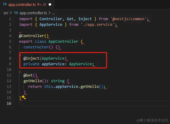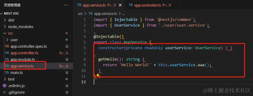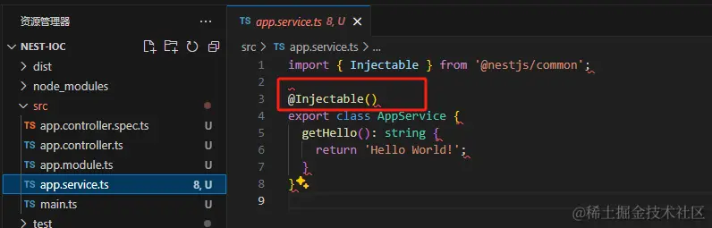 我们可以看到在app.service,他声明了 @Injectable,代表这个 class 可注入,那么 nest 就会把它的对象放到 IOC 容器里