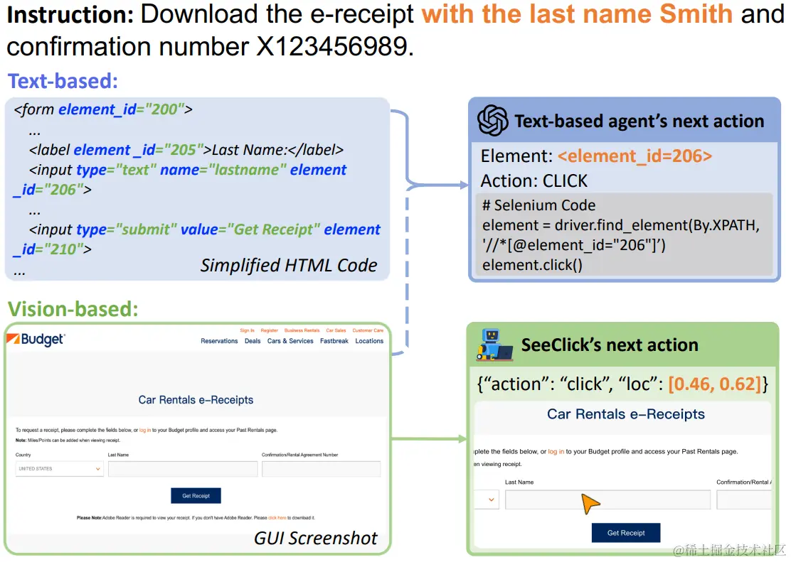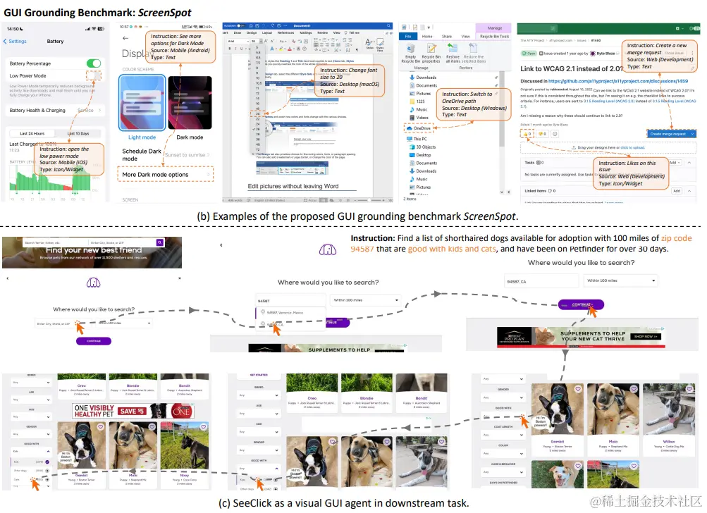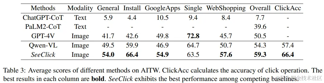 可以看出,SeeClick 直接借助了视觉-语言大模型的能力并观察 Screenshot 来生成点击位置。