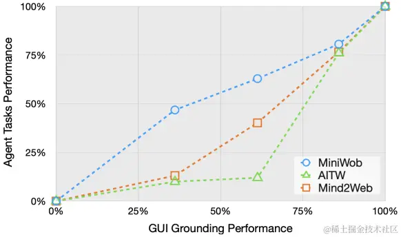 实验结果表明,提升GUI grounding能力是提升agent任务性能的关键因素(如下图所示):SeeClick相比基线Qwen-VL[4]取得了显著的性能提升,表明了本文提出的GUI pre-training策略的有效性和纯视觉方案在GUI任务自动化上的潜力。具体而言,在MiniWob上SeeClick只用了千分之三的数据量即超过了之前的视觉SOTA方案Pix2Act。