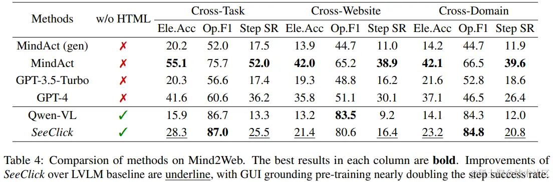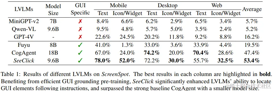 从上述结果可以明显的看出,经过设计的GUI Grounding预训练之后,SeeClick相比LVLM基线展现了优越的性能。