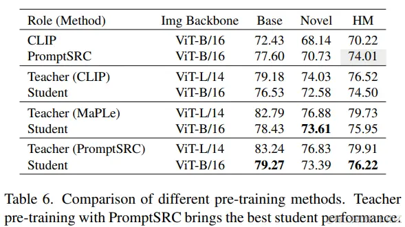 在PromptKD中,任意类型的ViT-L/14 CLIP教师模型都可以蒸馏出一个很好的ViT-B/16 CLIP模型,相比于baseline (70.22 HM)都有明显的提升。