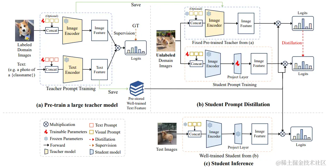 蓝色部分代表的是学生 CLIP,这里其实就只有一个 image encoder,在带有 learnablr prompt 的输入进入 image encoder 之后会得到对应的image feature,这是因为与teacher text feature在维度上不匹配,所以经过一个Projector,将512转成768维的特征。然后再与 Pre-stored Text Feature 相乘,得到logits。