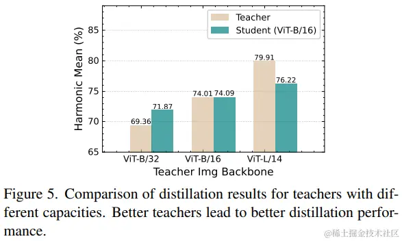 最后,再探讨下不同容量教师模型的选择。如表5所示,绿色代表学生ViT-B/16 CLIP的HM分数,土黄色代表教师的HM分数。可以看出:教师的性能越高,越能训练出更好的学生。