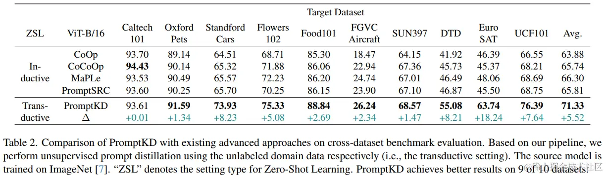 这里有一点非常有意思的是,我们可以看到,第四行的Teacher(CLIP) ViT-L/14也就是原始的CLIP模型,在经过PromptKD的蒸馏之后,我们的ViT-B/16 CLIP的结果(表1(b))明显超过了原始的ViT-L/14 CLIP模型。(77.62 vs. 76.52)
