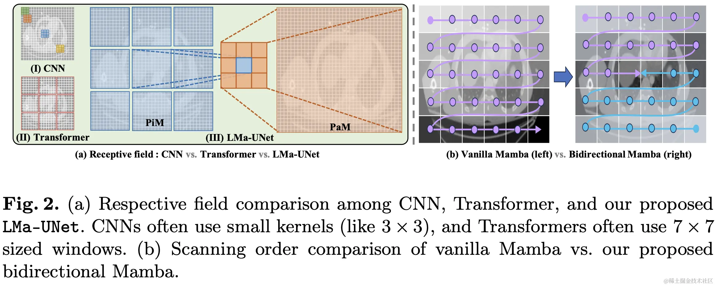 图2(a)展示了LMa-UNet与CNN、Transformer的感受野对比。CNNs的kernel感受野通常在, Transformer系列的window感受野通常在,而本文提出的LMa-UNet的感受野则可扩展到.