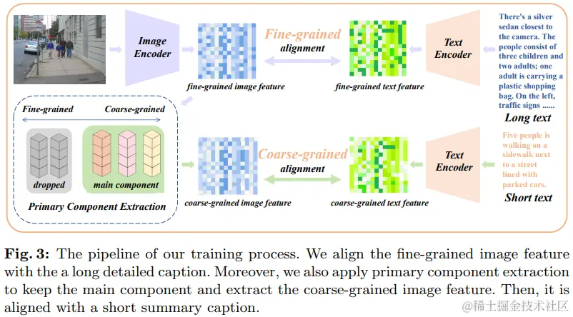 Primary Component Matching):除了将图像的细粒度特征与长文本描述对齐外,该方法还从细粒度图像特征中提取粗粒度信息,并将其与短文本描述对齐。这要求模型不仅能捕捉图像中的不同细节,还能识别其中最重要的组成部分。