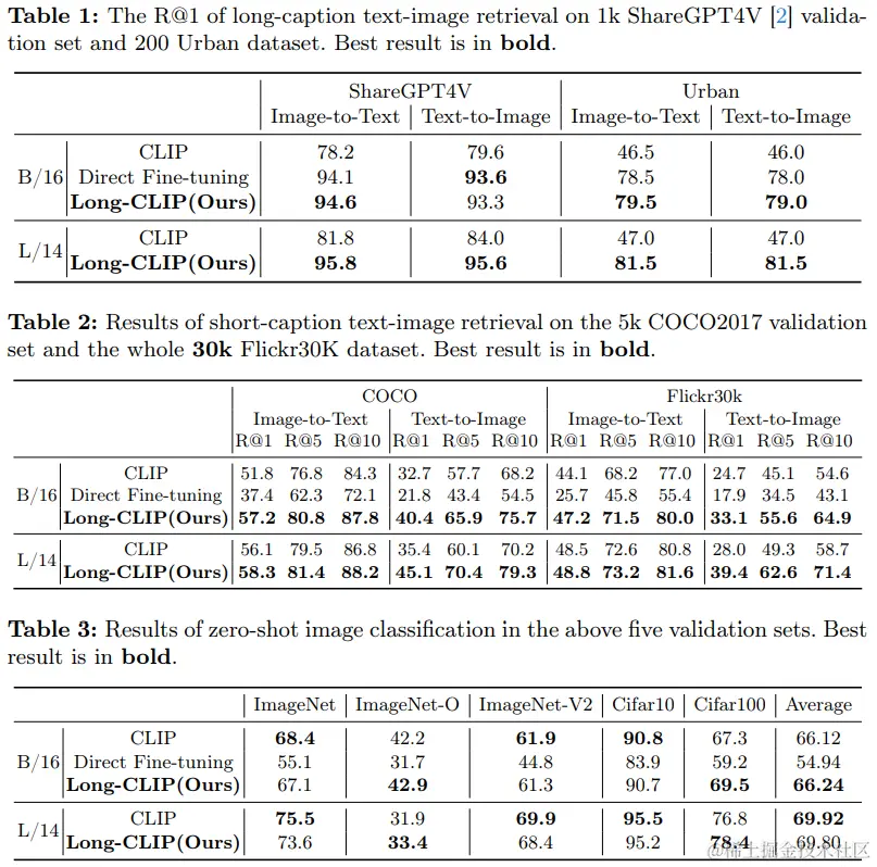 - 零样本图像分类: 在多个验证集上,Long-CLIP在保持原始CLIP模型零样本分类性能的同时,展现了更好的性能。