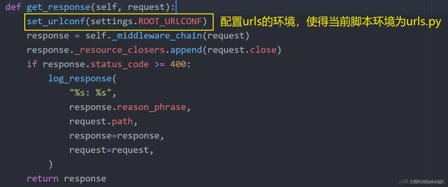 我们传递了请求到来的request参数,通过get_response进行处理,最后返回响应,说明在get_response中就已经做好了路由匹配。