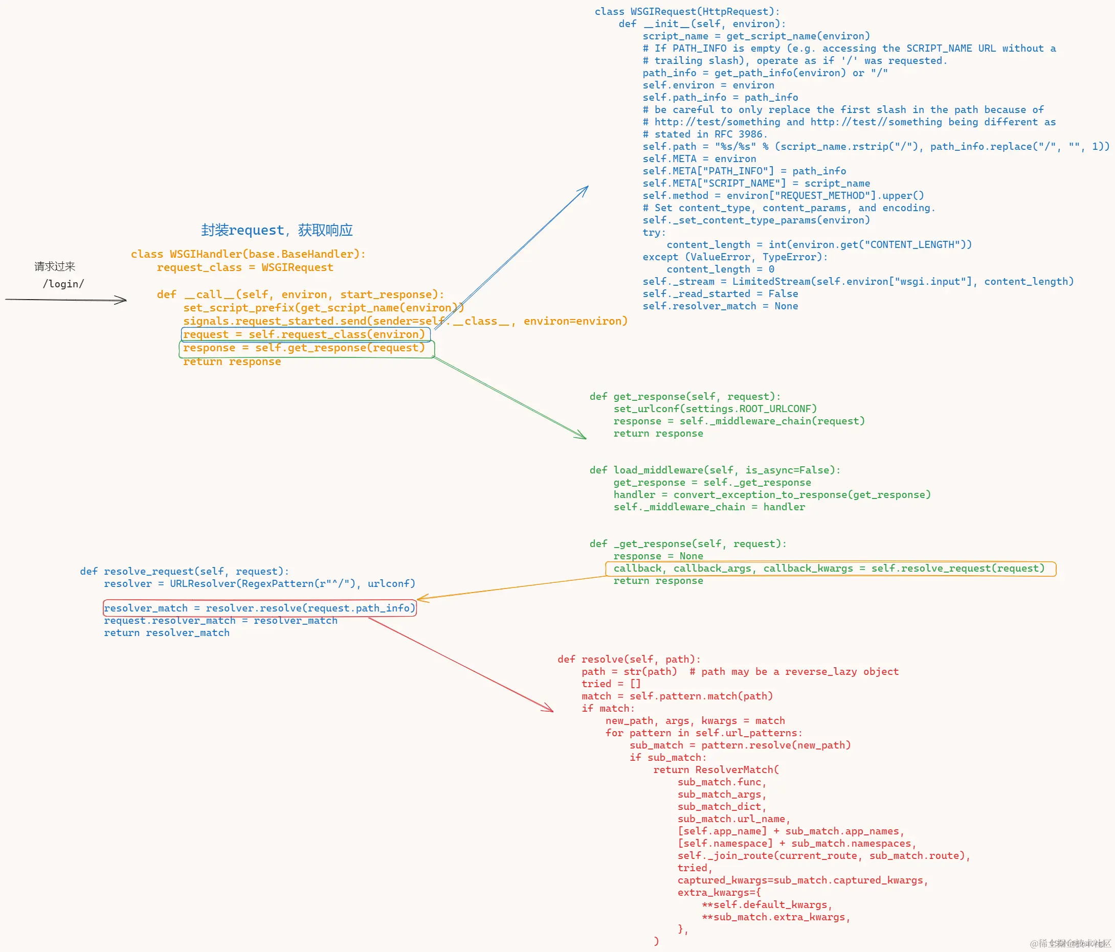 如果我们使用的是同步请求(不涉及到异步),那么,请求的入口就是WSGI,也就是wsgi.py