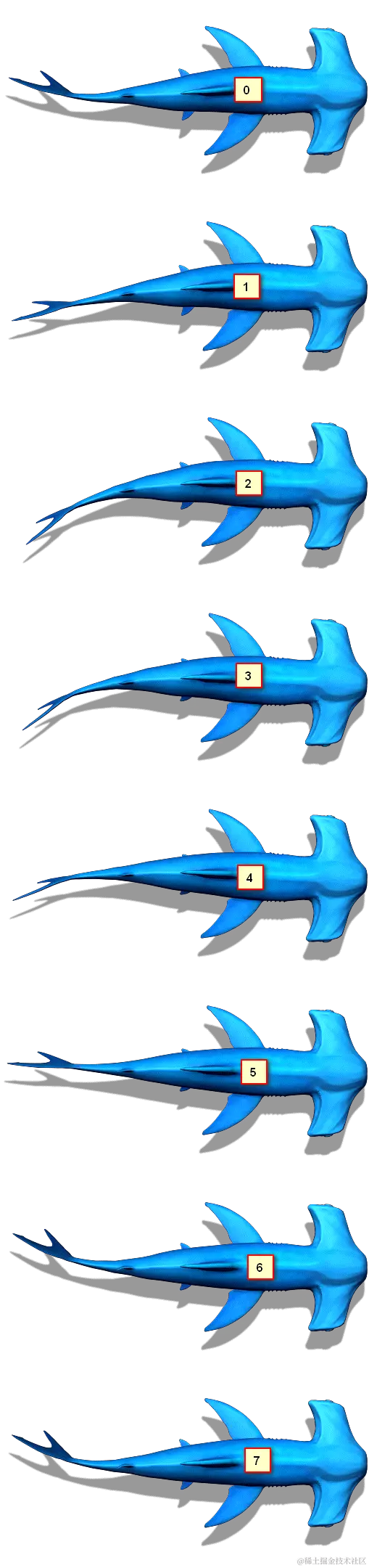 animation: sharkRun 1s steps(8) infinite; /* 一秒之内,从顶部移动到底部,分八帧 */