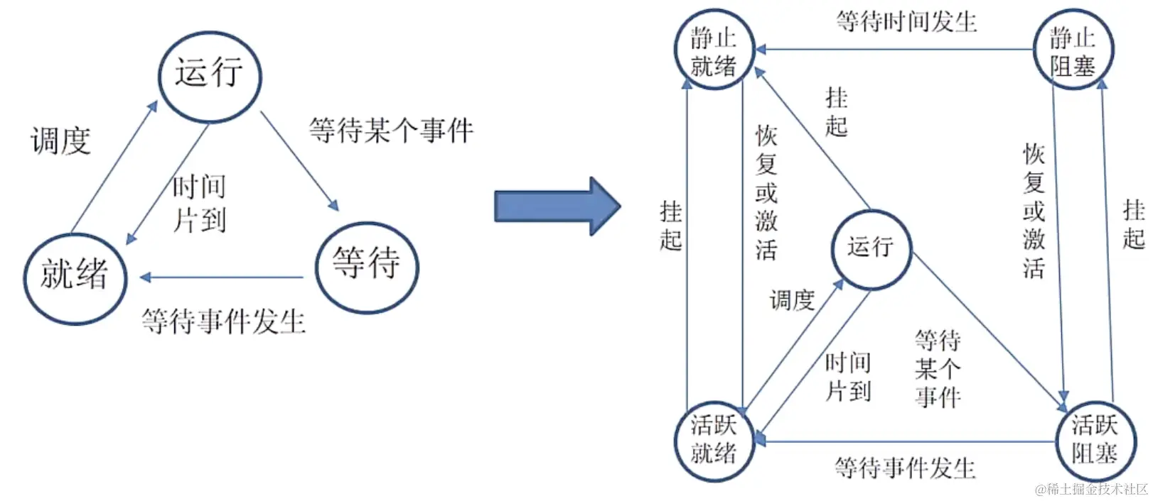 进程基础的状态是下左图中的三态图,这是系统自动控制时只有三种状态,而下右图中的五态,是多了两种状态:静止就绪和静止阻塞,需要人为的操作才会进入对应状态,活跃就绪即就绪,活跃阻塞即等待。