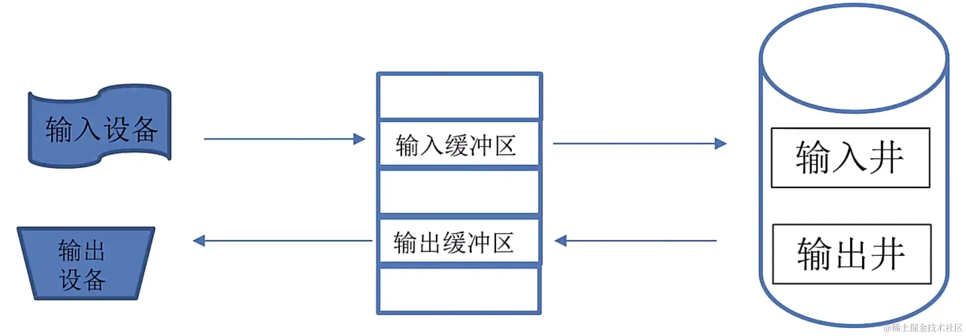 引入SPOOLING技术,就是在外设上建立两个数据缓冲区,分别称为输入井和输出井,这样,无论多少进程,都可以共用这一台打印机,只需要将打印命令发出,数据就会排队存储在缓冲区中,打印机会自动按顺序打印,实现了物理外设的共享,使得每个进程都感觉在使用一个打印机,这就是物理设备的虚拟化。如下图所示: