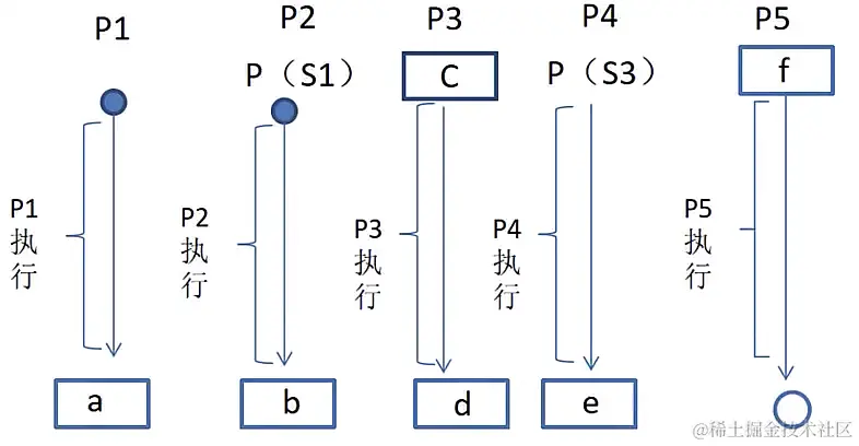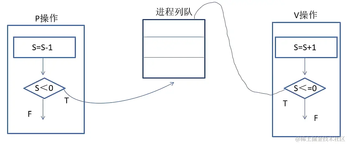 P操作:申请资源,S=S-1,若S>=0,则执行P操作的进程继续执行;若S<0,则置该进程为阻塞状态(因为无可用资源),并将其插入阻塞队列。