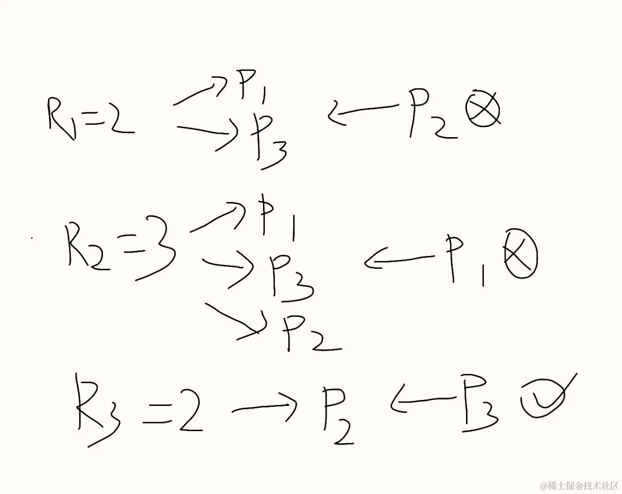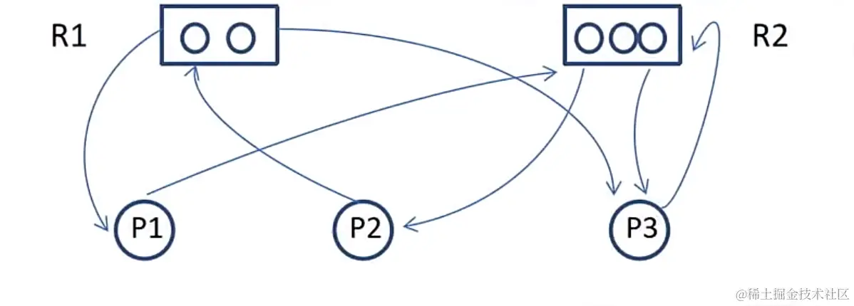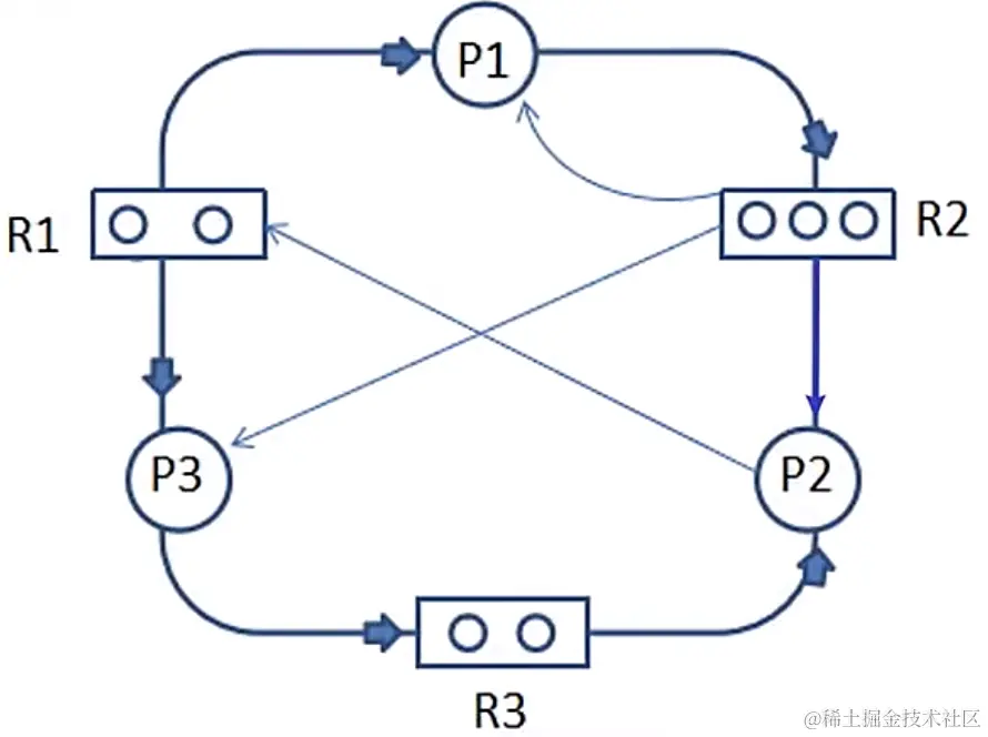 P代表进程,R代表资源,R方框中有几个圆球就表示有几个这种资源,在图中,R1指向P1,表示R1有一个资源已经分配给了P1,P1指向R2,表示P1还需要P1请求一个R2资源才能执行。