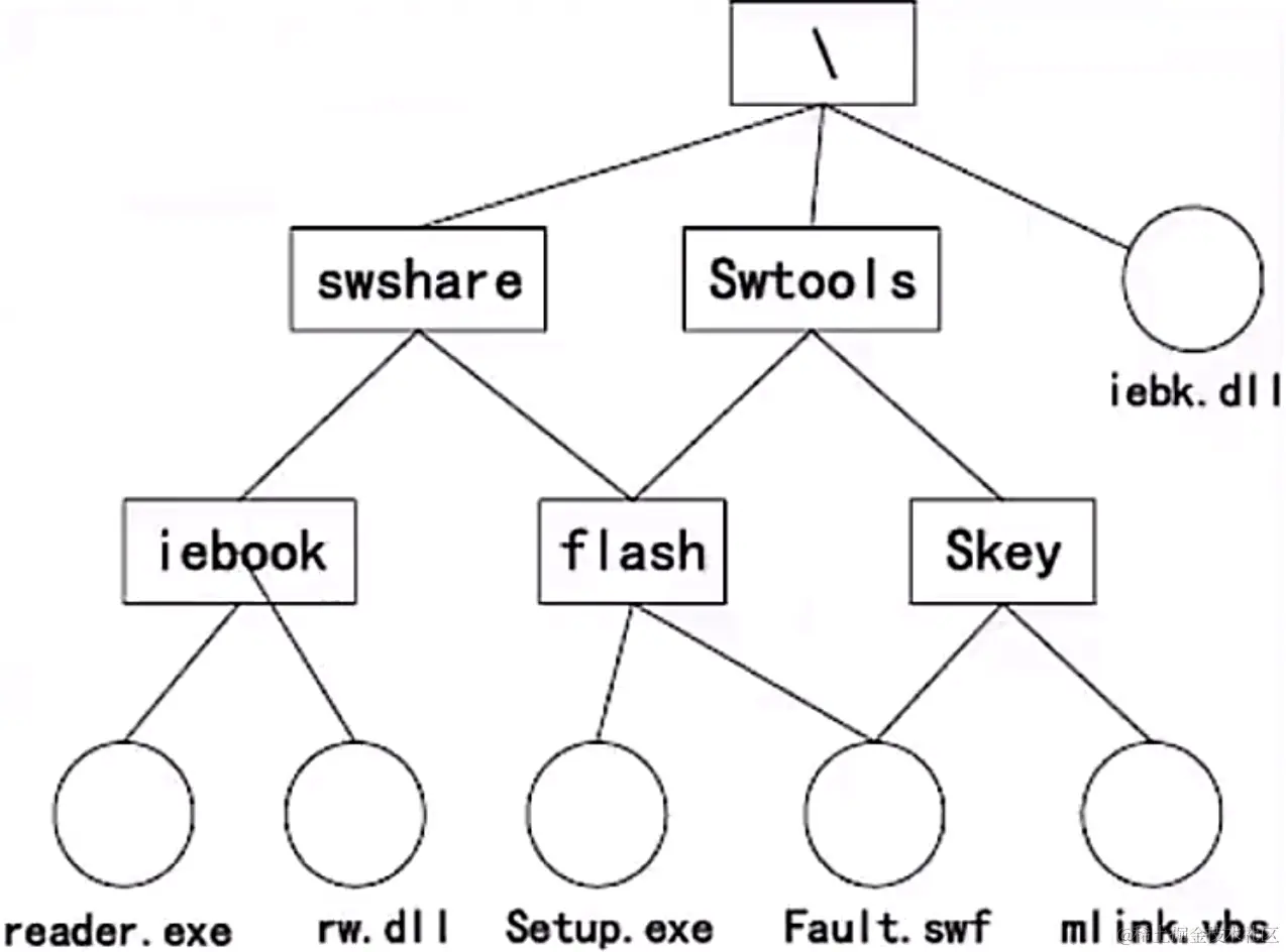 若某文件系统的目录结构如下图所示,假设用户要访问文件Fault.swf,且当前工作目录为swshare,则该文件的全文件名为(27),相对路径和绝对路径分别为(28)。